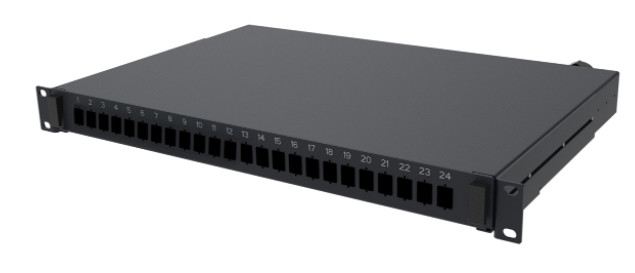 Fiber Optic Panel, 1 U, 19 in, unloaded for holding up to 24 LC/UPC duplex adapters, black.